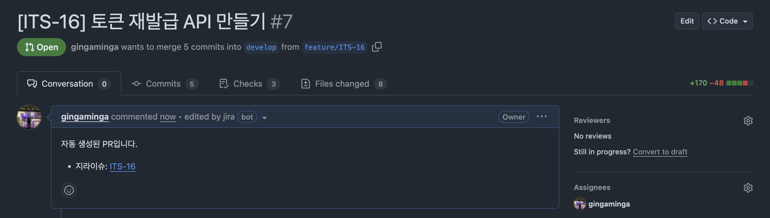 혼자 하더라도 체계는 갖추고 싶어 적어도 Jira와 PR은 사용하고 있다.